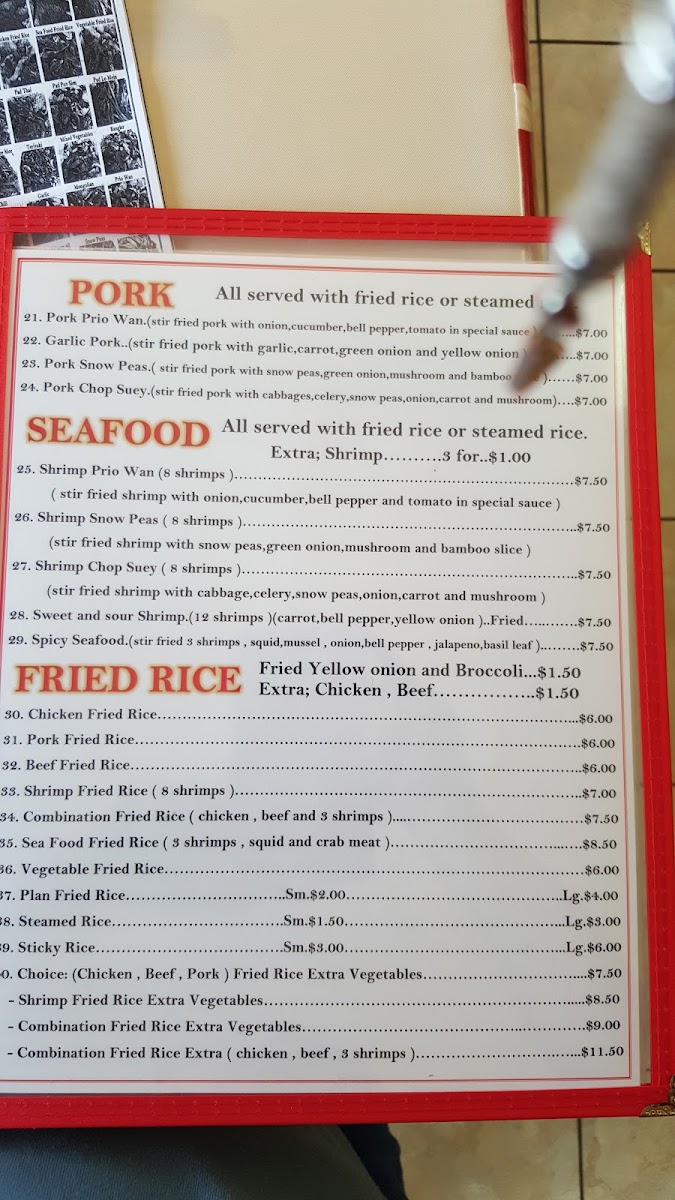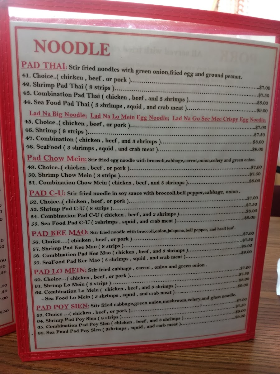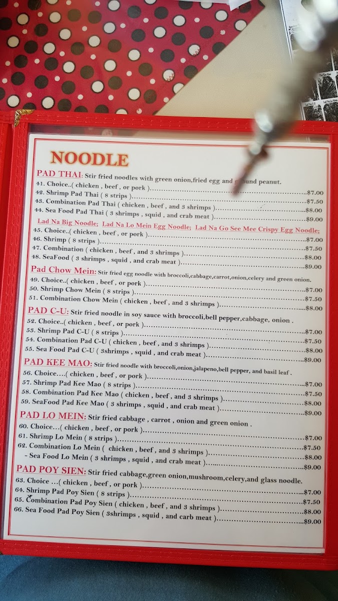 Alongside savory mains, casual items like Lumpia and various egg rolls make for great starters or snacks, while the variety of pad lo mein and fried rice dishes provide satisfying options any time of day. The approachable, clean presentation of the menu mirrors the straightforward, welcoming vibe of the restaurant—making it a practical choice for anyone seeking real, authentic flavors without fuss.